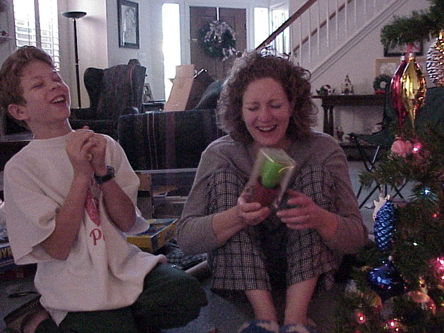 | Kevin and Beth get a big laugh out of the cactus paper clip holder from Mom and Dad G. |